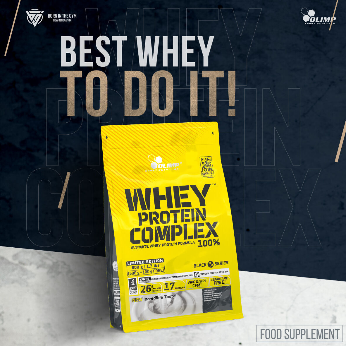 Olimp WHEY PROTEIN COMPLEX 100%. Food supplement. High protein concentrate in powder. With sweeteners.